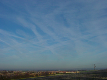 | Due to the relatively moist upper air in the morning of 9th February 2004 aircraft contrails were slow to dissipate and pronounced displays of this phenomenon were seen over central England. In this view (as seen at 0914 GMT) looking north-westwards from Hyde Hill, Royston over the northern fringes of the town and beyond on to the South Cambridgeshire Plain, an abundance of contrails can be detected, albeit mostly in an advanced state of dissipation. After an overnight minimum of -1.6°C the temperature is -0.5°C, later rising to a maximum of 5.0°C. The wind direction is westerly and of mean speed 4 knots, gusting to 10 knots. A very sunny day followed (8.2 hours sunshine). | It may still be the winter season but the Winter Garden at Anglesey Abbey, Cambridgeshire (28 km NE of Royston) is alive with blossom and colour as evidenced in this photograph taken at 1318 GMT on 21st February 2004. In addition to the shrubs and trees in blossom many specimens exhibit coloured stems and branches to complement the many shades of green and add to the overall effect. Although the temperature is not far from average at 6°C (maximum temperature at Royston 6.3°C, 1.0°C below the 30 Year mean for this day) a fairly strong NE wind is introducing a significant wind chill factor. The day was predominantly bright but cloudy, and bright sunshine was restricted to just 1.2 hours at Royston. | At first sight this scene at the Newmarket Road Playing Field in Royston (as seen on 25th February 2004 at 0903 GMT) may appear to show a branch of a tree but it is, in fact, the trunk! It stands prominently at one of the entrances to the Playing Field and takes a horizontal gait for most of its length. An overnight snow shower has left a light covering of snow, visible also on Hyde Hill in the distance. The temperature is -1.3°C (overnight minimum -2.2°C), whilst the wind is from a north-westerly direction, and of mean speed 2 knots, gusting to 10 knots. Bright sunshine (total 8.8 hours) prevailed for most of the day, which made a welcome change from the rather dull nature of much of February to date. |